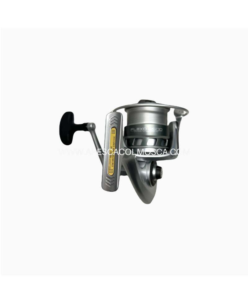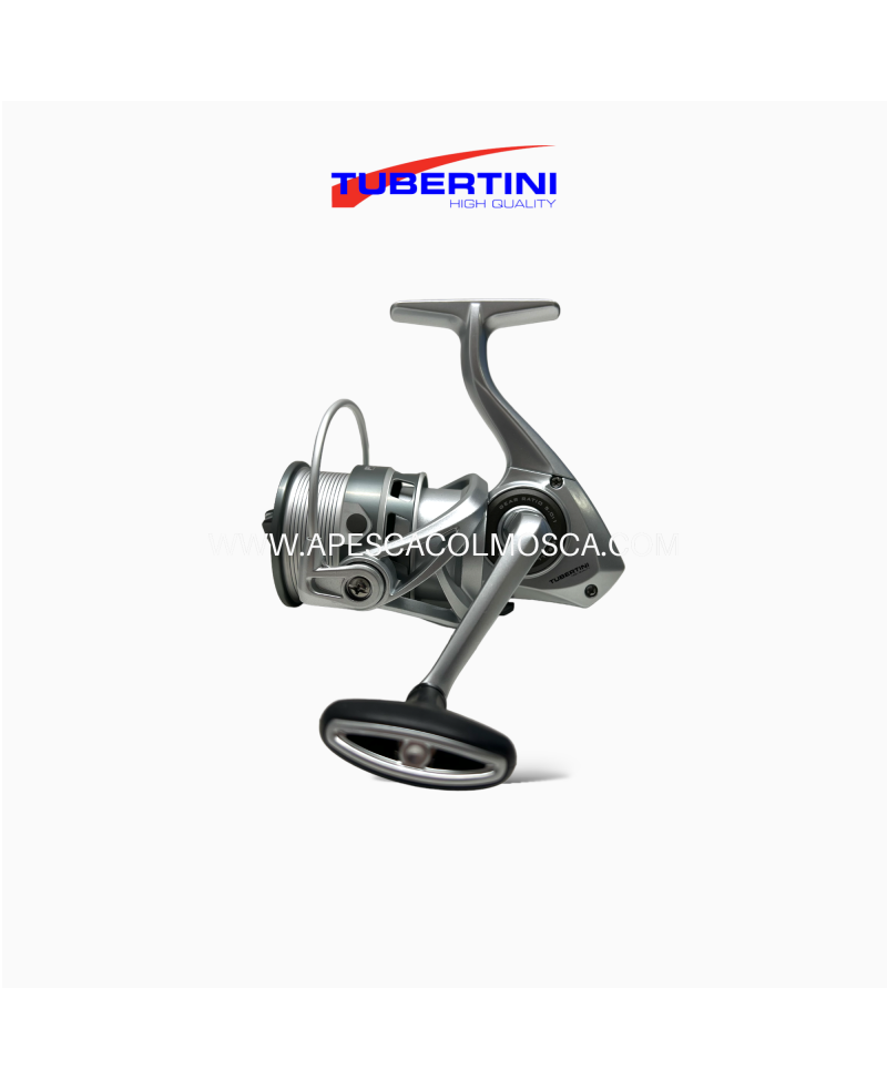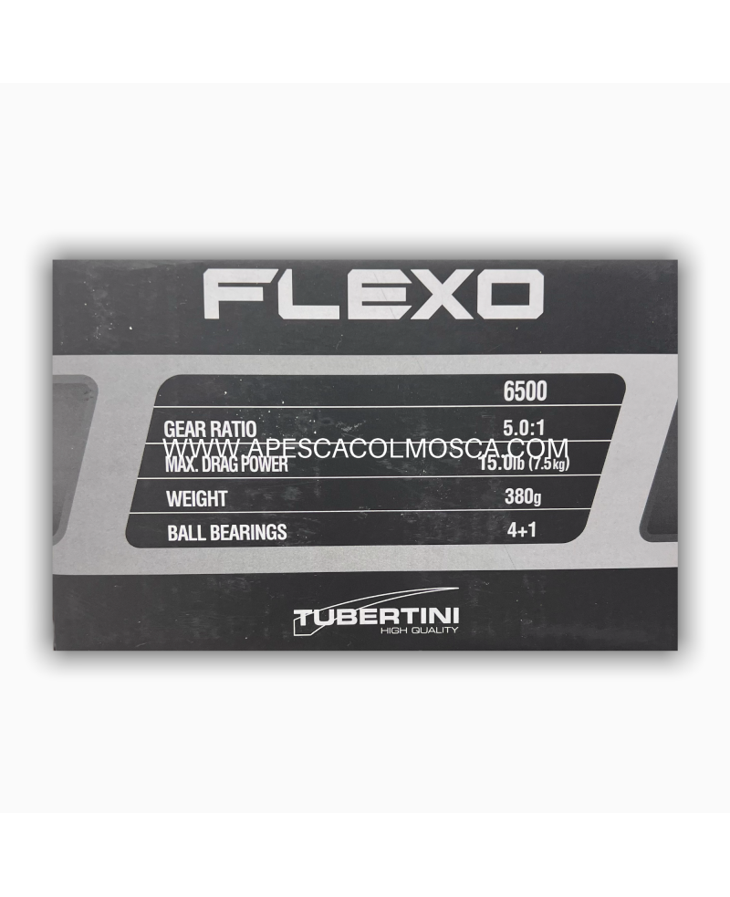Mulinello da Competizione Tubertini Flexo 6500. Mulinello studiato appositamente per la competizione, con bobina match e manovella one touch. È dotato di una meccanica molto affidabile e robusta supportata da 4 cuscinetti a sfera di alta qualità e da un cuscinetto a rulli, il tutto racchiuso in un corpo in grafite, materiale di cui è composto anche il rotore e che conferisce robustezza e rigidità. Ottimo rapporto qualità prezzo.
