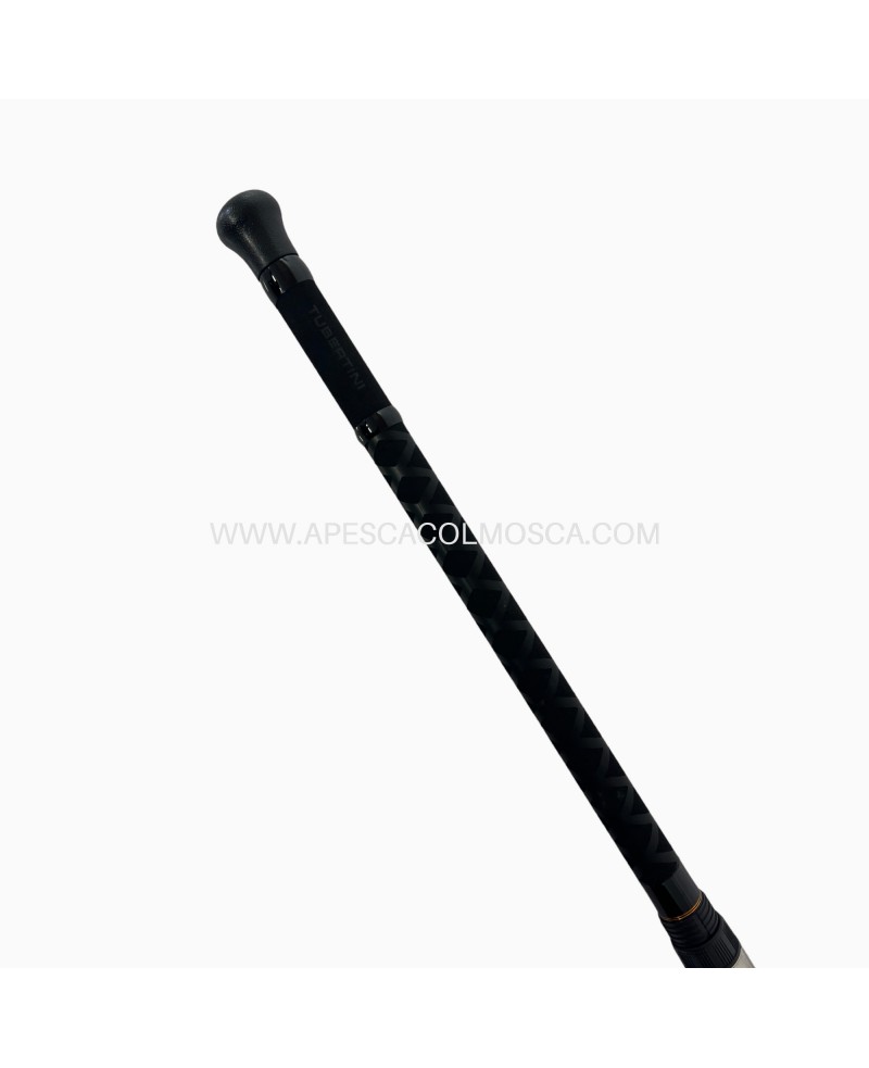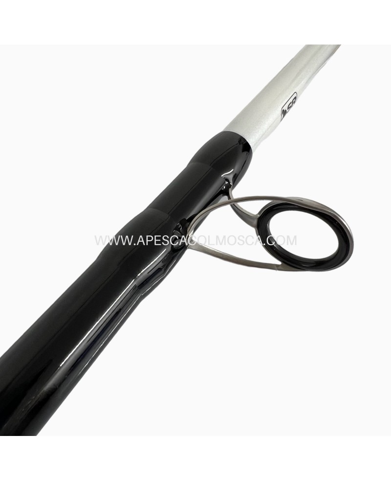 Serie di canne per la pesca a bolentino medio composte da due sezioni con attacco a spigot e base a diametro maggiorato per offrire una ottima bilanciatura e riserva di potenza. Sono dotate di due cime ad innesto di diversa potenza e robusti anelli Fuji. Il portamulinello ergonomico ha la ghiera di fissaggio a vite, ed il tappo posteriore è in gomma per agevolare il confort durante le fasi di combattimento. Ottime le finiture con gli esclusivi inserti in tessuto di carbonio nella zona dello spigot ed il manico in Shrink Rubber per una presa sicura e confortevole.