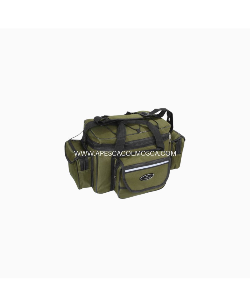 Borsa di medie dimensioni realizzata in tessuto di ottima qualità, rinforzato e impermeabilizzato. Dotato di scomparti rimovibili e tasca aggiuntiva che conterrà perfettamente "l'arsenale" di accessori del pescatore attivo (in movimento). Completa di tracolla e cerniere di ottime finiture.