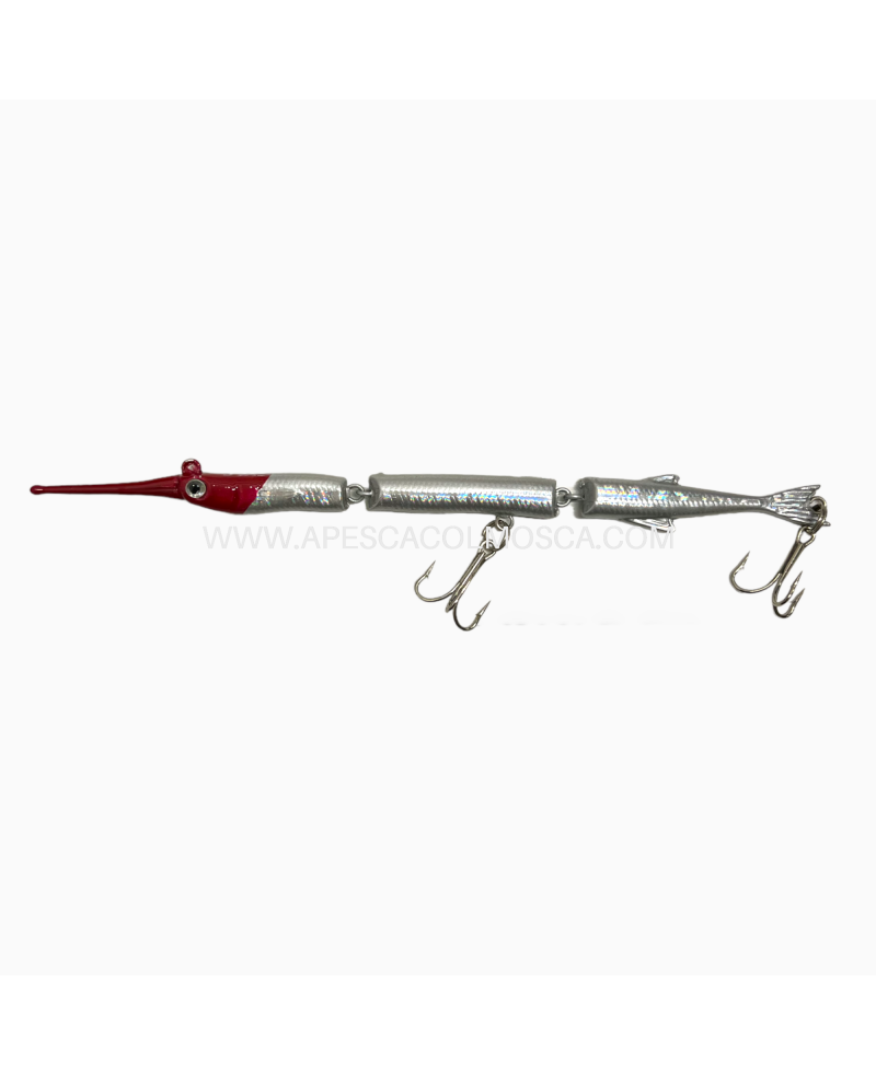 Artificiale jointed curato e rifinito nei minimi dettagli, perfetta riproduzione di una aguglia in 3 sezioni, particolarità che rende questa esca, viva una volta in acqua e caratterizzata da un movimento molto sinuoso mediante l’ utilizzo di sezioni dalla forma particolarmente idrodinamica. Armata con due ancorette salt water garantiscono ferrate sicure evitando inaspettate slamature, massima tenuta anche con i più grandi predatori. Nata per la traina si rivela micidiale per tutti i predatori del sottocosto, disponibile da 16,5 cm e 20,5cm trova un giusto impiego anche per lo spinning costiero e dalla barca la dove si ha la necessità di avere un artificiale “vivo” in acqua.