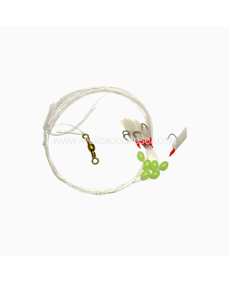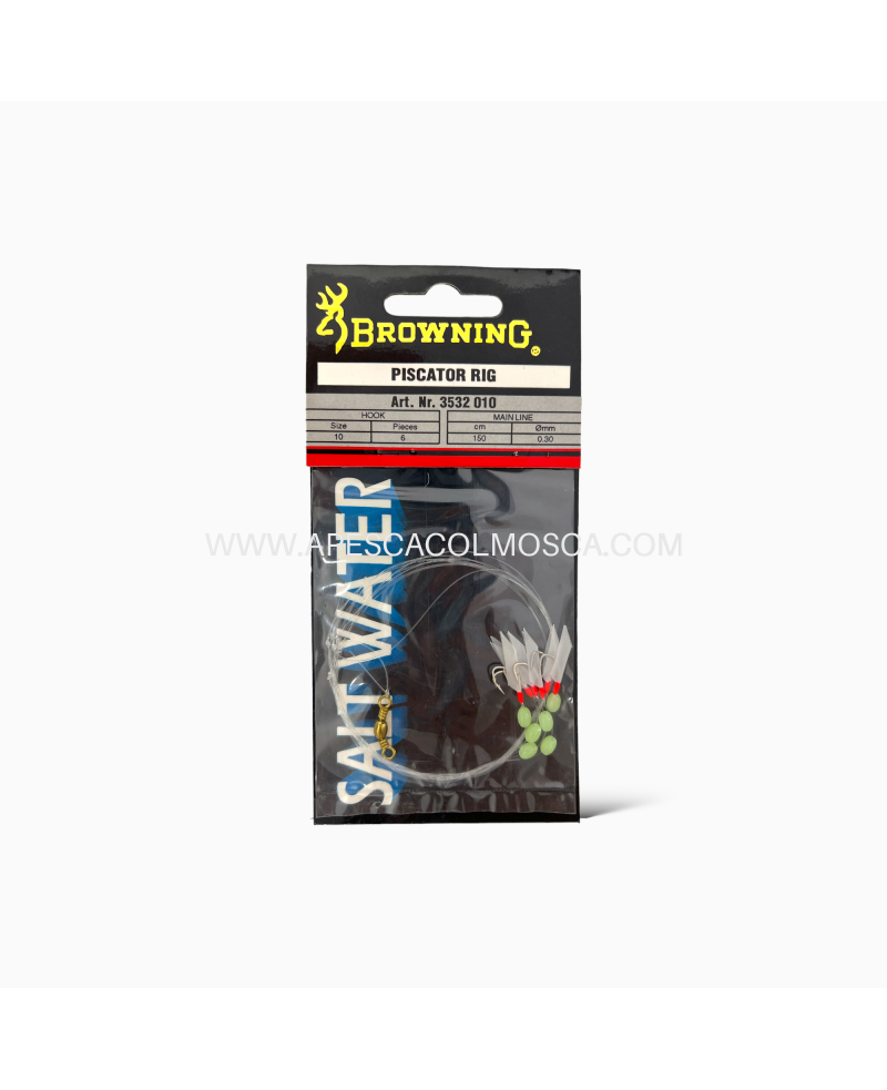 Montatura Sabiki Piscator Rig 3532 di casa Browning per la pesca a bolentino dalla barca per insidiare piccole e medi predatori pelagici come sgombri, lanzardi e sugarelli. Gli ami in carbonio affilati chimicamente sono equipaggiati in skirt bianco con puntino rosso e perline fluorescenti. Vi suggeriamo di utilizzare i nostri Sabiki con una piombatura proporzionata alla corrente.