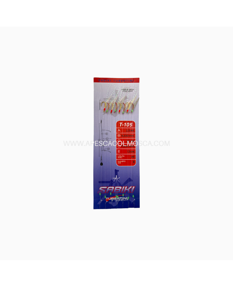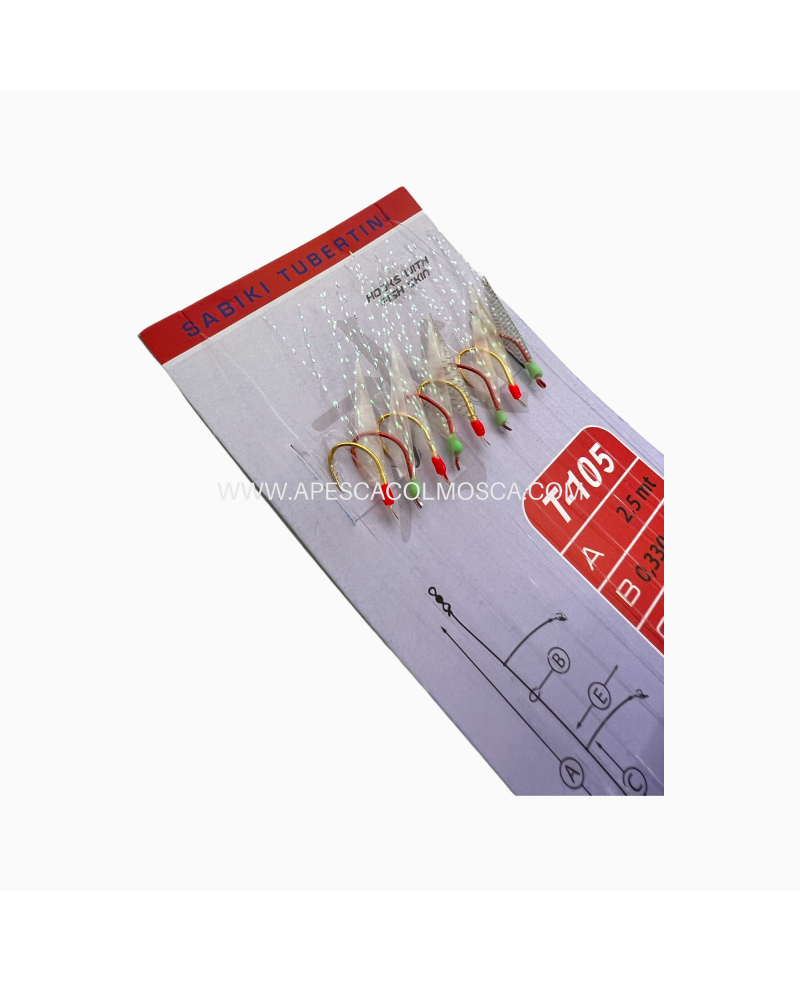 Innovativo sabiki sia da fondale che da pesci pelagici. Realizzato con autentica pelle di pesce molto lunga, filamenti in crystal flash ed una goccia di vernice verde fosforescente per gli ami di colore rosso e di vernice rossa fluo per gli ami dorati.