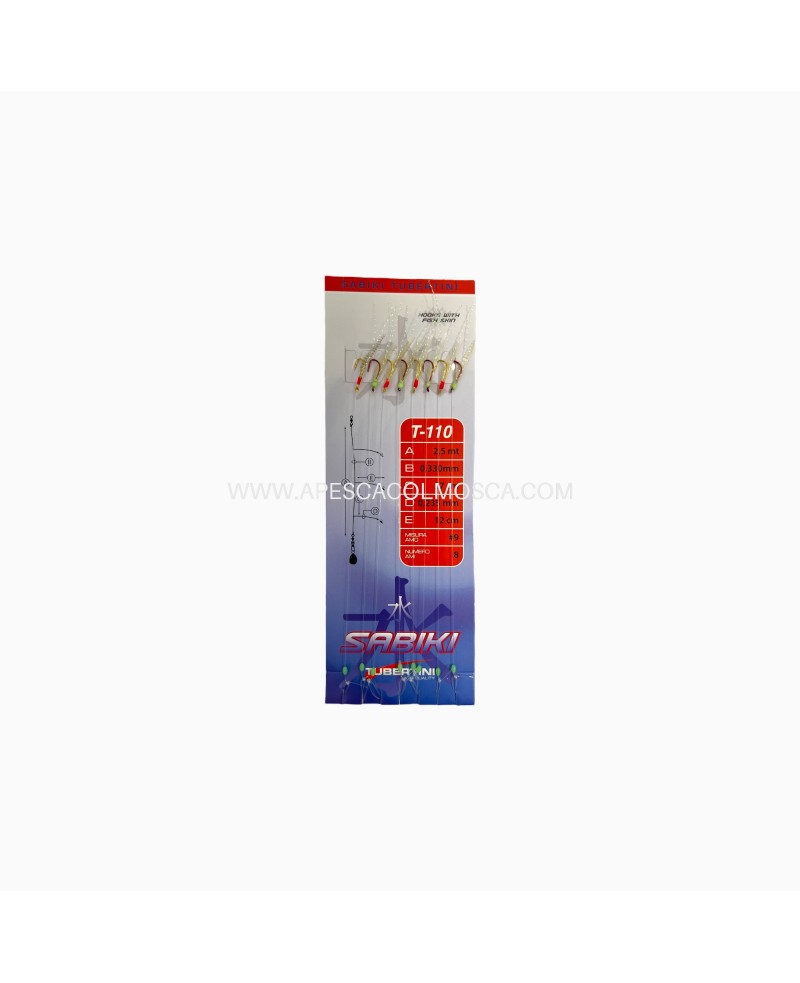 Innovativo Sabiki realizzato con autentica pelle di pesce, filamenti in crystal flash, una vernice fosforescente verde sulla legatura degli ami di colore rosso ed una vernice fluorescente rossa per gli ami dorati.