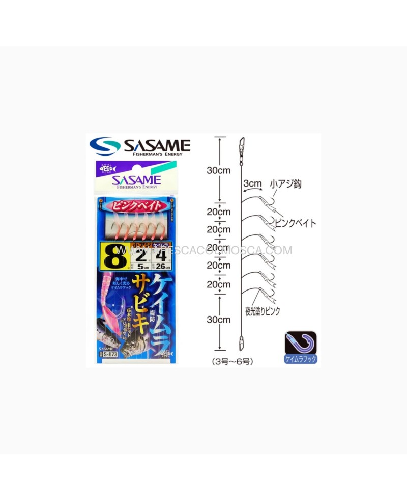 Il Keimura Hook Sabiki Pink Bait S-873 della Sasame è un sabiki composto da 6 ami di colore argento con filamenti rosa. Questo sabiki è dedicato alla pesca dell'Aji, ovvero del Sugarello.