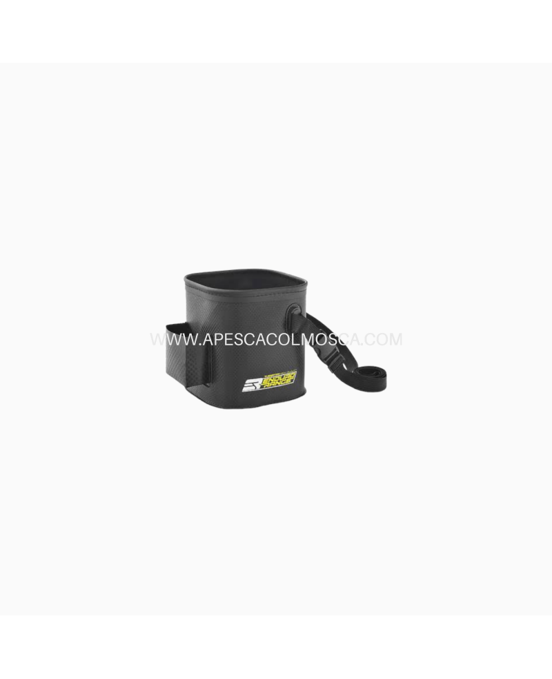 Secchiello porta bigattini in PVC termosaldato "effetto carbonio" con tracolla e tasca porta fionda. Ideale per la pesca in fiume.