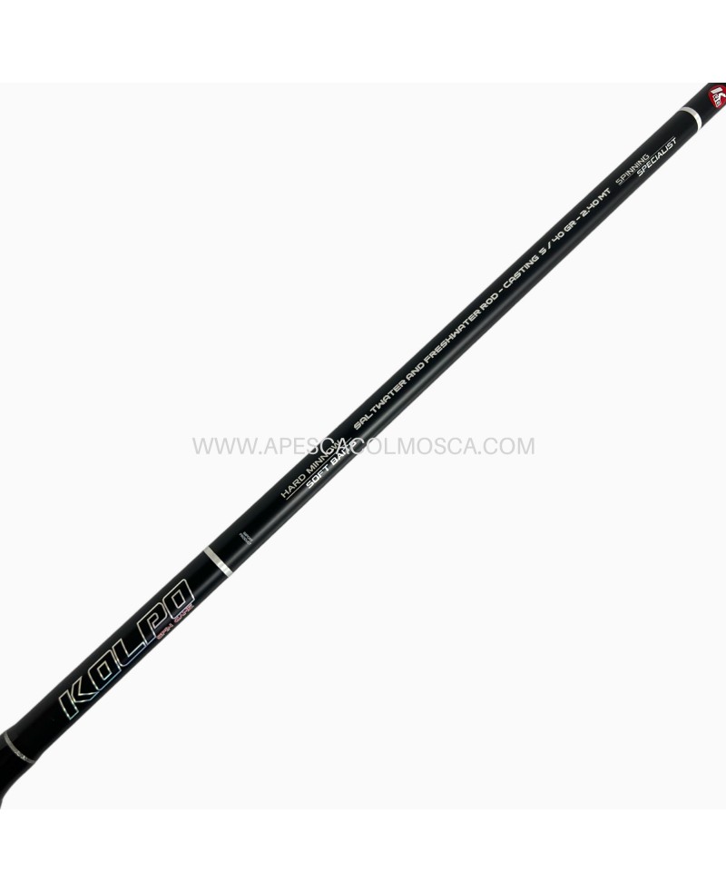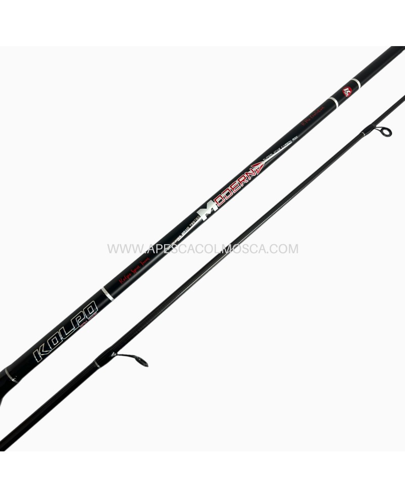 Canna da pesca spinning, Kolpo Moderna, azione e lunghezze che la rendono versatile in qualsiasi spot sia in acqua salata che in quella dolce. Adatta per qualsiasi condizione sia più o meno estrema, grandiosa a sua affidabilità. La qualità del fusto in carbonio 24T abbinato al design innovativo e giovane la rendono gradevole sia dal punto di vista estetico che funzionale.