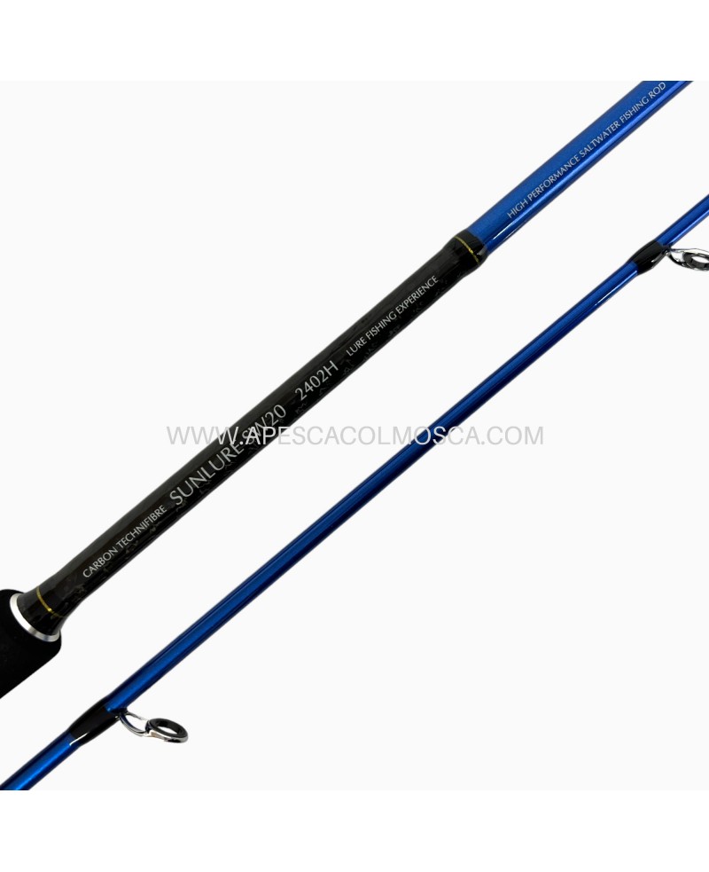 Sunset Sunlure SW20, serie di canne da spinning a 2 pezzi per la pesca a spinning in mare montate con grezzo in fibra di carbonio “Technifibre” 24T. Realizzate con impugnatura "splitted" in EVA nera, porta mulinello tubolare a vite molto solito tipo VSS silver, anelli anti-tangle “K Frame” con pietra SiC, vetta tubular e un fodero in tessuto. Le canne da mare da spinning Sunset, sono consigliate per la pesca in mare di spigole, barracuda, serra e altri pesci predatori (a seconda del modello scelto) con un amplio ventaglio di tecniche ed ed esche. Si caratterizzano per essere canne da spinning economiche ma dalle ottime prestazioni e decisamente affidabili.