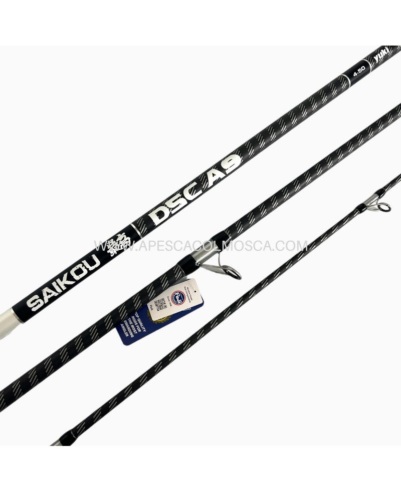Lunghezza: 4,50m / 15' - Peso 598GR - Tipo di carbonio: Carbonio super leggero ad alto modulo - Guide: Fuji, Minnesota - Azione: H -100-250gr - Portamulinello: FujiDPS - Mancia : Ibrido