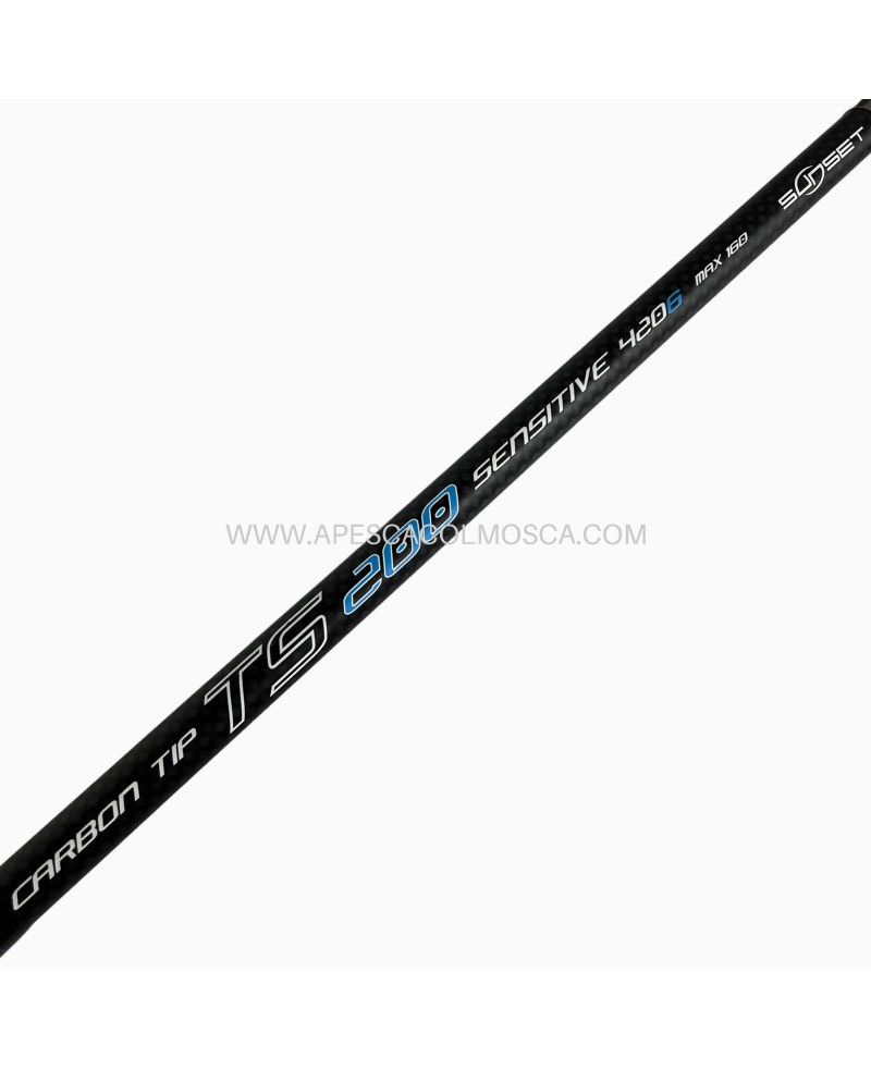 Le canne da surfcasting SUNSET TELESURF TS 200 hanno un blank telescopico in carbonio “Technifibre” 24T, un pomello in alluminio, un'impugnatura antiscivolo “soft touch”, un porta mulinello tubolare ergonomico, anelli legati, una vetta corta in carbonio e una custodia in plastica e tessuto.