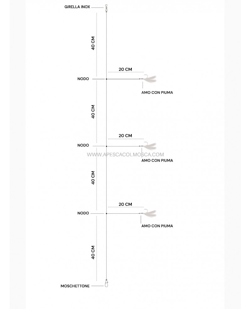 I finali sono del diametro dello 0.40 e gli ami inox permettono di utilizzare la filosa molte volte poichè non arrugginiscono .