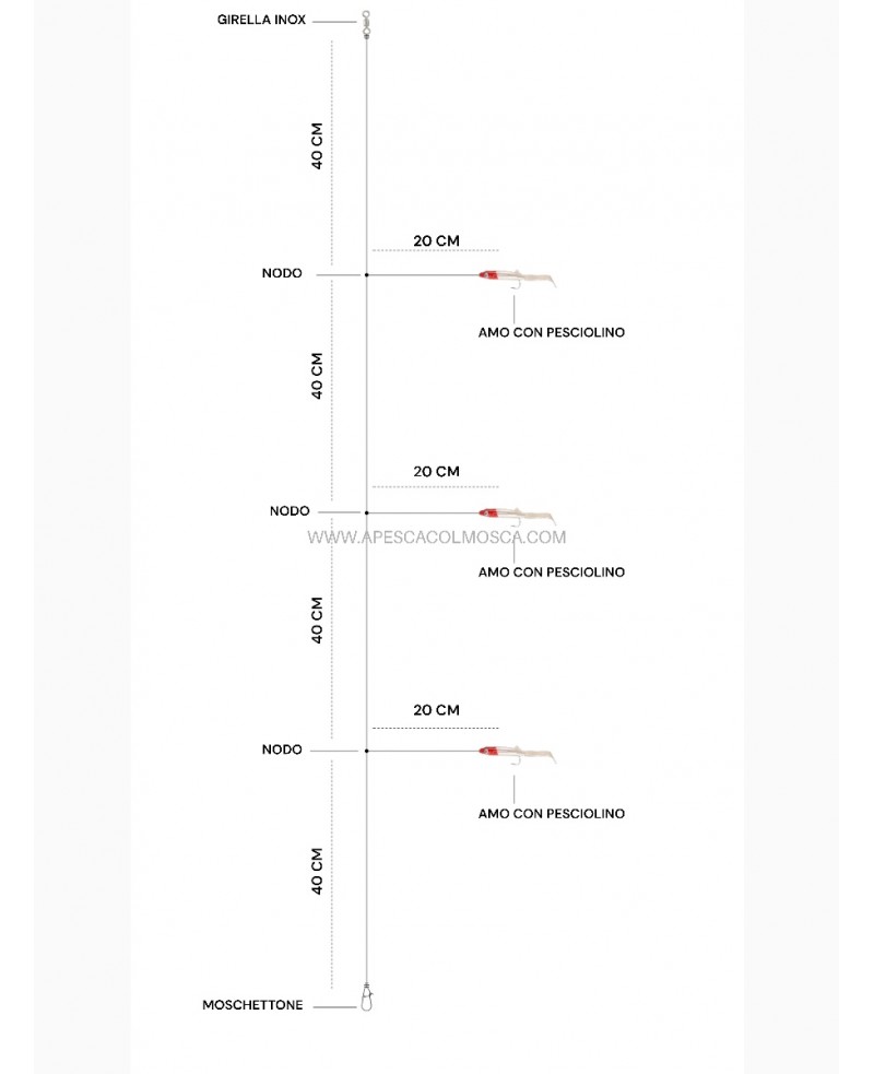 La madre lenza del trave è composta con filo Fluorine dello 0.45 , in testa è abbinata una girella inox della misura 8 .