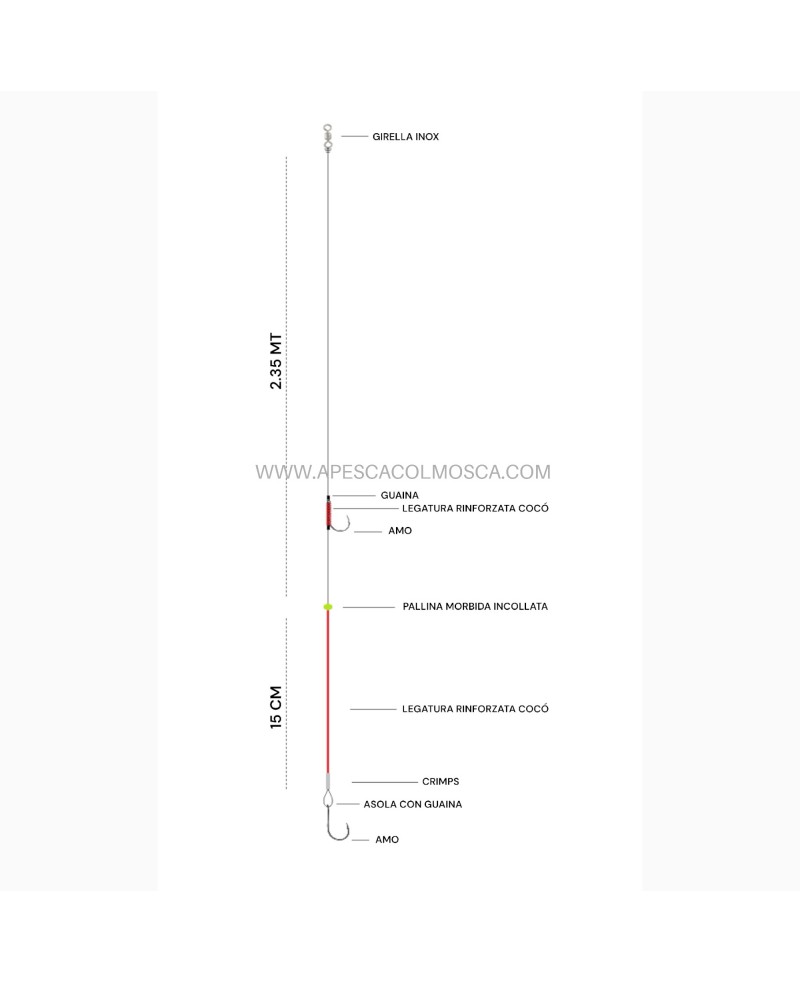 Ideale per dentici, cernie, ricciole e capponi. Le migliori esche da innescare sono seppia e calamaro, in mancanza di queste possono andar bene anche sgombri, sugherelli e alaccie. Il terminale ha un rinforzo negli ultimi 15-20 cm, questa è una sicurezza per i denti affilati dei pesci.