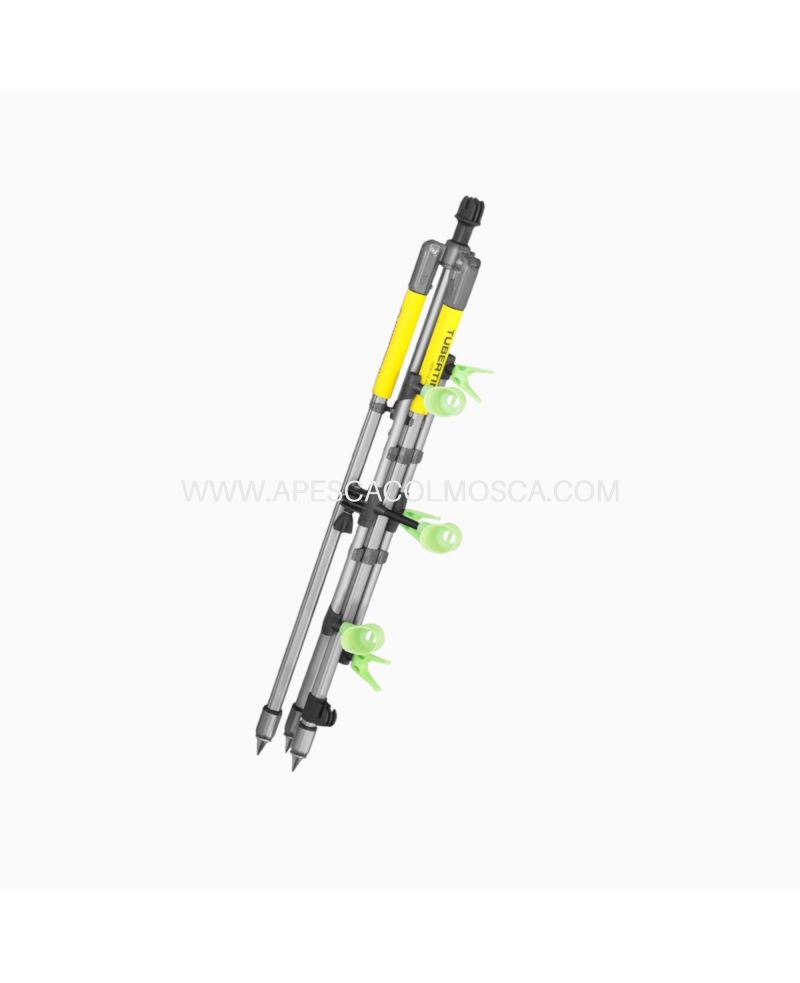 Appoggia canne totalmente regolabile grazie alle gambe telescopiche ed alle barre ad inclinazione variabile, che montano supporti fluorescenti per una visibilità nelle ore notturne. Totalmente richiudibile per un pratico trasporto, ha inserti in EVA ed un comodo gancio al quale appendere un secchio o altro materiale, per aumentarne la stabilità in caso di vento. Ideale per le tecniche di pesca in mare da riva, come il surf casting, il beach ledgering e la pesca da scogliera. Il blocco di fissaggio delle gambe è realizzato in alluminio per una maggior resistenza e tutti i blocchi delle gambe sono rivestiti in alluminio per evitare rotture durante l’utilizzo.